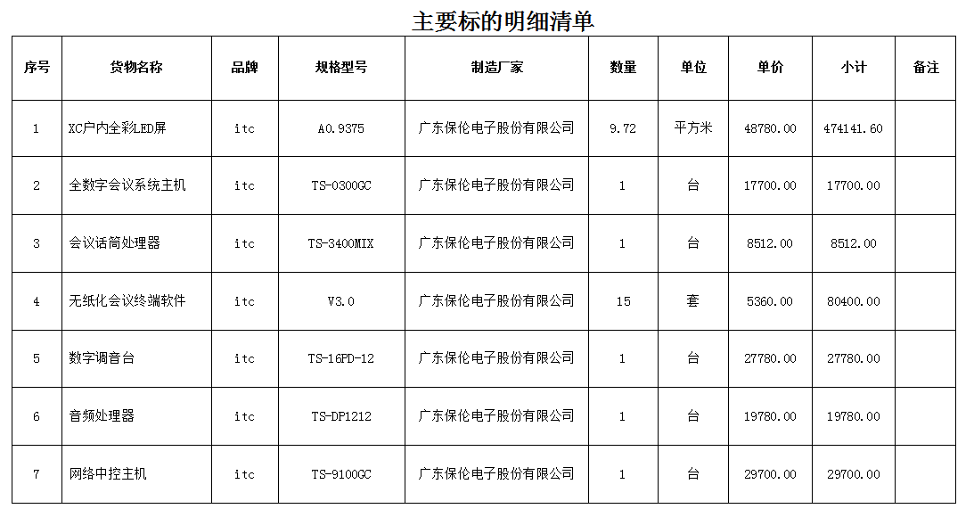 | 1 | 其他广播、电视、电影设备 | 报告厅及会议音响灯光系统和门禁系统 | XC户内全彩LED屏:itc | XC户内全彩LED屏:A0.9375 | 1.00(批) | 5,489,857.60 | 5,489,857.60 |